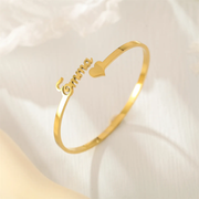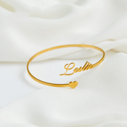 Add a touch of charm and personalization to your jewelry collection with our Custom Open Cuff Bangle with Heart Bracelet. This minimalist yet meaningful piece features an open cuff design that gently hugs your wrist, finished with a delicate heart on one end and your custom name, initial, or word engraved on the other.