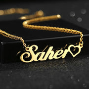 Custom name necklace with heart charm – beautifully crafted by Sairahaz Jewelers. Personalize it with any name and choose from 18K gold-plated stainless steel or 925 solid sterling silver. A heartfelt piece that blends elegance with sentiment.