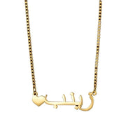 The Customized Arabic Name Necklace with Heart is a romantic and meaningful statement of love and identity. This Arabic name necklace showcases your chosen name in elegant script, paired with a delicate heart accent for a truly personal touch. Available in stainless steel, 14K gold name necklace, or 18K gold custom necklace, this personalized name necklace blends cultural elegance with modern style.