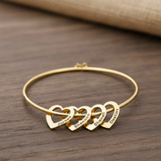 This personalized bangle brings multiple names together in one polished design with engraved heart charms that keep the piece sentimental without feeling overly heavy. It is built for customers who want family-focused jewelry with stronger gift value and a cleaner premium finish.
